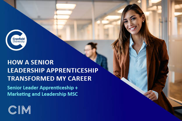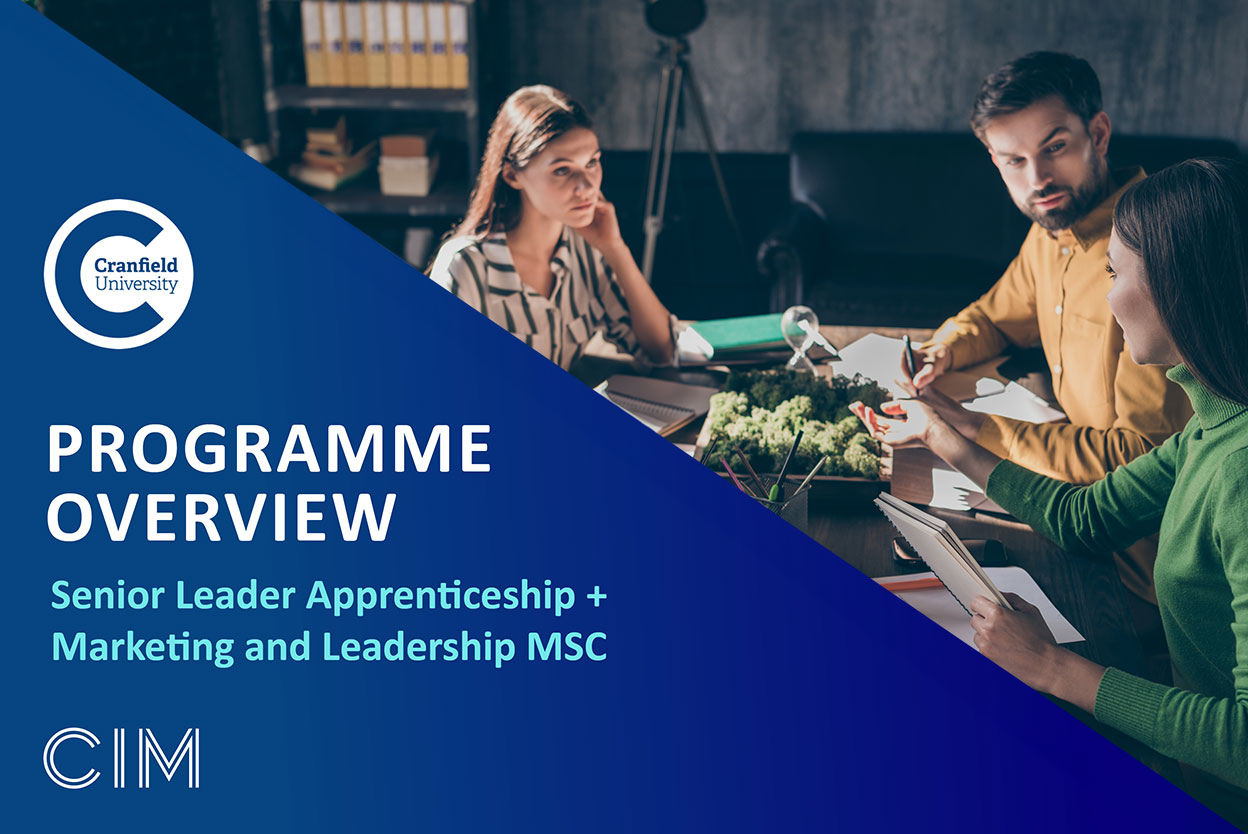 The Senior Leader Apprenticeship + Marketing and Leadership MSc developed in partnership with Cranfield School of Management and CIM Academy. This part-time programme runs over 26 months and is delivered in two parts. It offers the best of academic theory, commercial insights and practical application. By completing both parts, learners will achieve a dual qualification, the Marketing and Leadership MSc and the CIM Marketing Leadership Programme and an option to register for Chartered Marketer status.