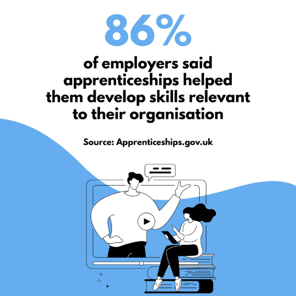 According to Apprenticeships.gov, 78% of employers said apprenticeships helped them improve productivity, and 74% of employers said apprenticeships helped them improve the quality of their products or service. Perhaps most importantly, 86% of employers said that apprenticeships helped them develop skills relevant to their organisation.