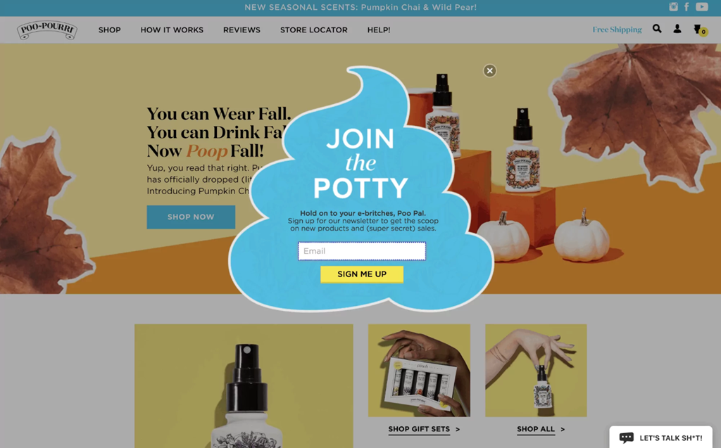 Here, Poo-Pourri (a creatively-named bathroom spray) remains incredibly on-brand with this email subscription pop-up. Everything from the shape of it, the headline ('Join the Potty'), to the call to action is amusing, relevant and intriguing.