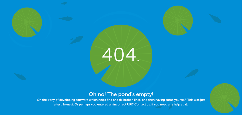 Take Screaming Frog, for example, a tool that helps website owners find and fix broken links. Here, it acknowledges the irony of having a 404 page, making fun of itself. The page is also animated with moving fish and lilypads, showing a little extra thought has gone into it.