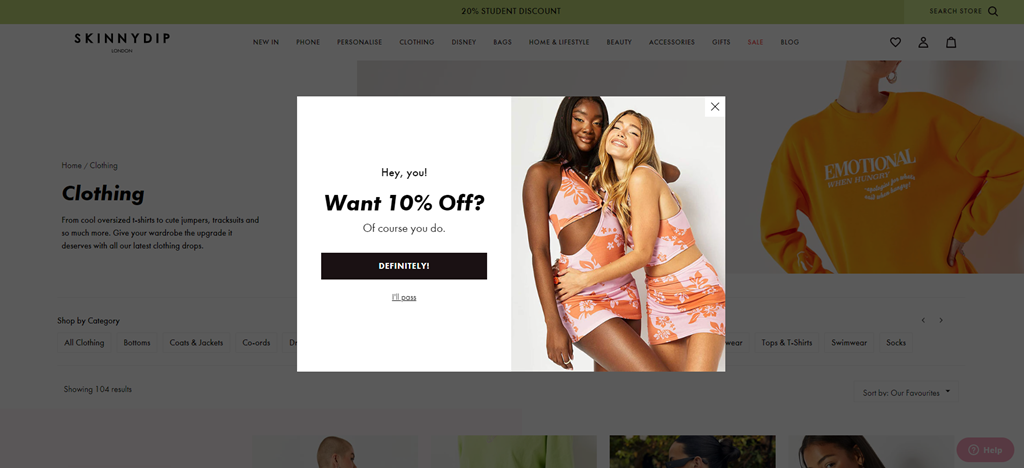 Fashion brand Skinnydip's pop-up is short and sweet and clearly understands its target audience. The copy used here sounds like something two best friends might text each other. It's also assertive in answering its own question with 'of course you do', eliminating any doubts the reader might have about engaging with the call to action.