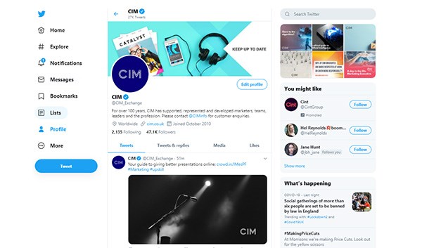 I’m continuously monitoring social media throughout the day amongst other tasks, but my morning always starts with a thorough search of the key social media channels. I’m looking out for any mention of CIM, any queries that need responding to and any news we might want to be aware of or create social content for. It is important that other teams within marketing, such as Content, Events or Creative, are up to speed on what’s happening online so they can be proactive in their activities.