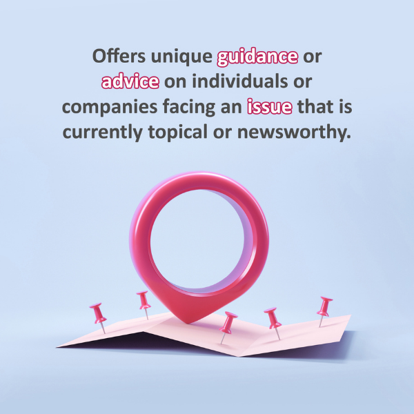 - Offering unique guidance or advice on individuals or companies facing an issue that is currently topical or newsworthy