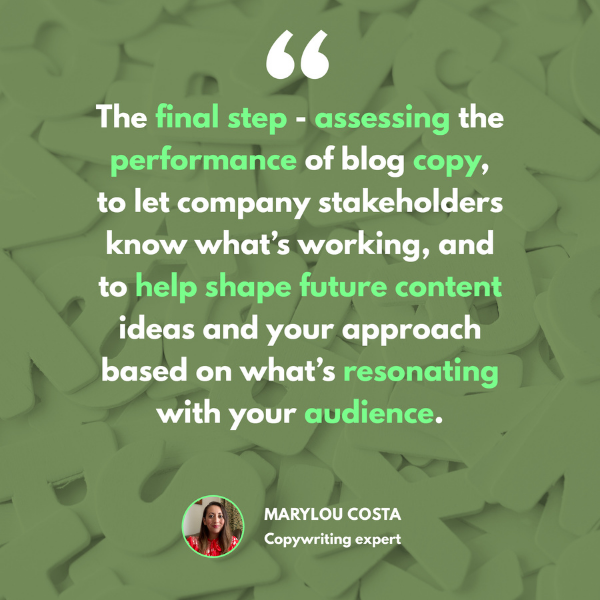 It’s also worth mentioning the final step - assessing the performance of blog copy, to let company stakeholders know what’s working, and to help shape future content ideas and your approach based on what’s resonating with your audience.