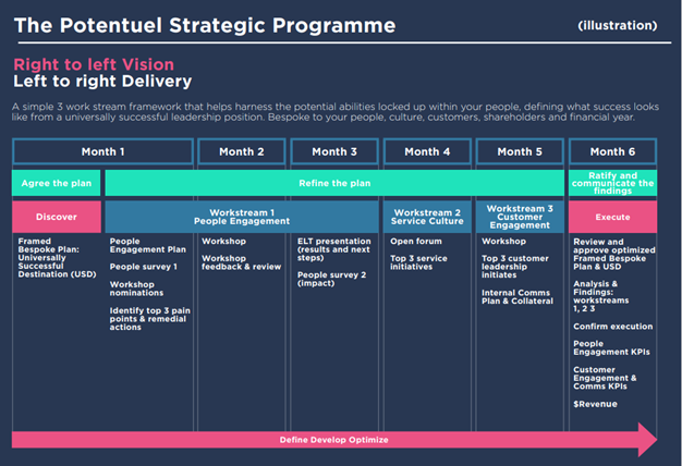 Implementing this vision within a business disciplined framework (as the illustration from Potentuel Management Consultancy above demonstrates) ensures it is not merely a siloed initiative, but one aligned with the financial year, customer needs and a continuous right to left view of the universally successful destination, then talent engagement and unlocking people potential can be the critical driver of long-term business growth in the new Covid world.