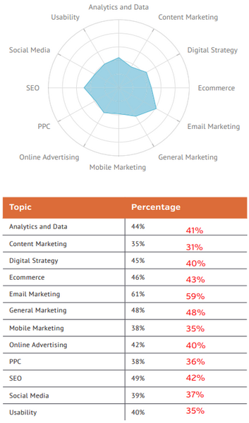 Yet, this is also a sector that has succeeded in more traditional marketing techniques, scoring highly in ‘general marketing’ and ‘email marketing’ in the previous survey. Interestingly, as can be seen in the table above, these scores have remained static or have fallen in the new survey and, though digital skills have increased, they still come from a very low base. More worryingly, digital strategy scores have fallen two points since the last survey.