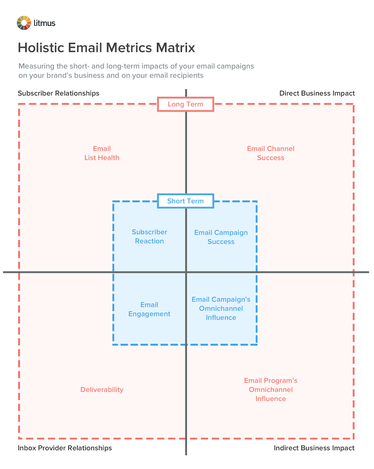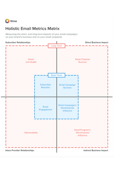 Where possible, try and take a holistic view of your email marketing efforts. Litmus’s Holistic Email Metrics Matrix provides a really clear, structured framework for measuring direct business impact, indirect business impact, subscriber relationships and inbox provider relationships from both a short and long-term perspective: