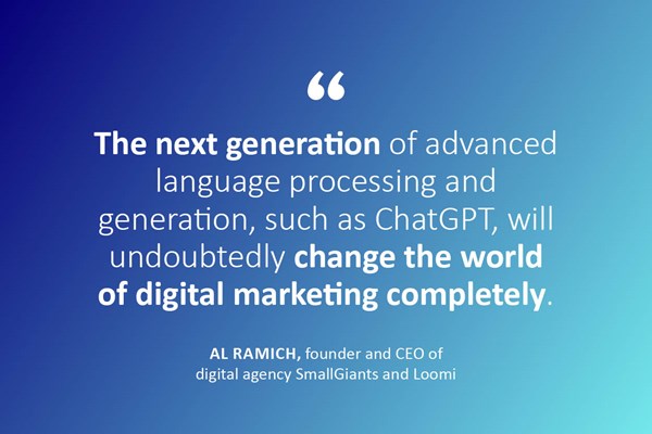 CIM’s Laura Bracher interviews Al Ramich, founder and CEO of digital agency SmallGiants and Loomi, about how artificial intelligence (AI) will change the future of content marketing. What tasks specific to content creation can ChatGPT support marketers with, and are marketers at risk of being replaced by AI?