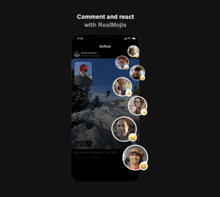 Users will not be concerned with likes or comments as there is no function for this. However, your friends can react to your post by using their RealMoji, which is an emoji of their own face copying an emoji reaction.