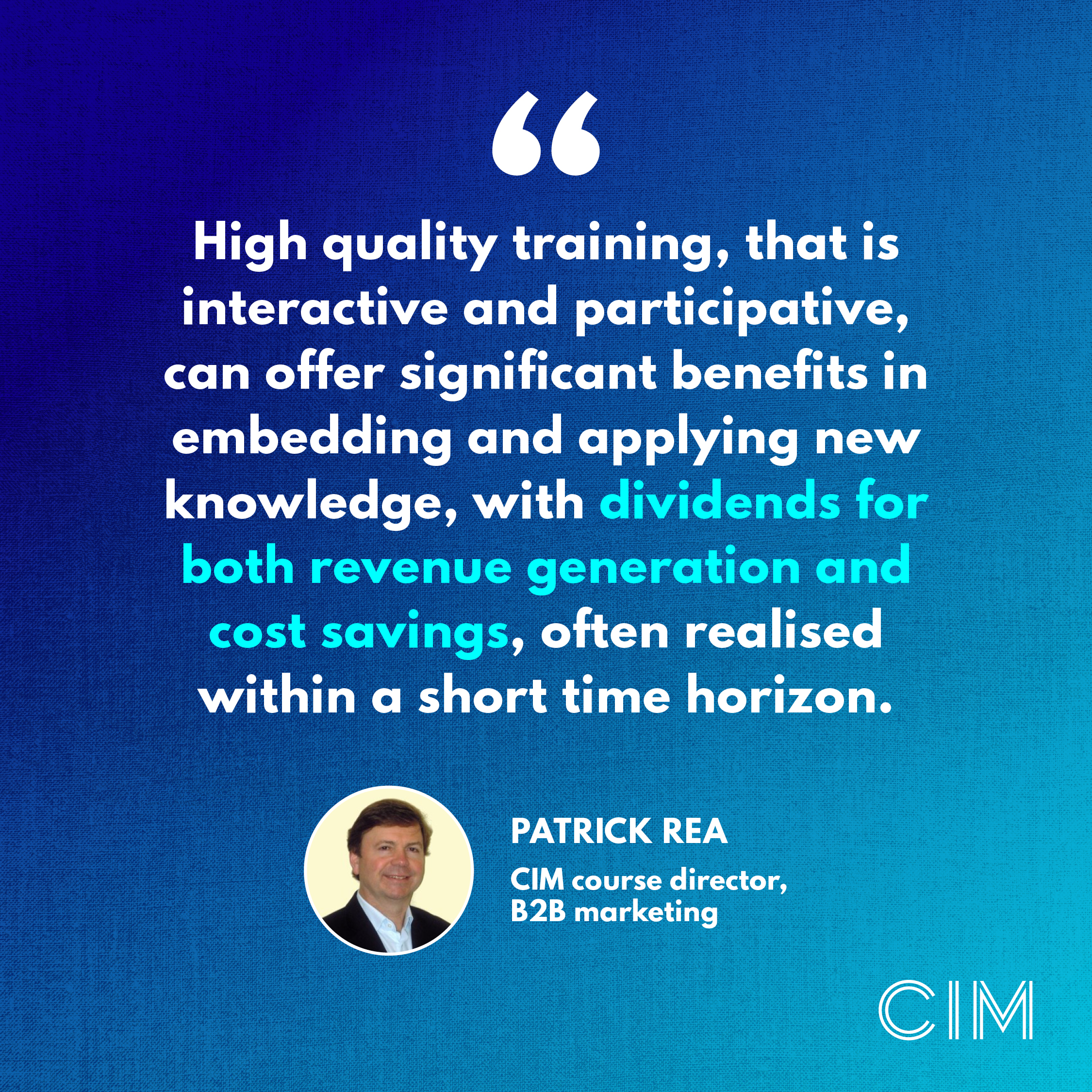 High quality training, that is interactive and participative, can offer significant benefits in embedding and applying new knowledge, with dividends for both revenue generation and cost savings, often realised within a short time horizon. Better trained staff are more effective and motivated. They will come away from training - such as from the open workshop format of many CIM courses - with fresh ideas, strategies and insights, to help create a culture of innovation. This is essential in a downturn, when doing the same old things in the same old way is probably not going to work.