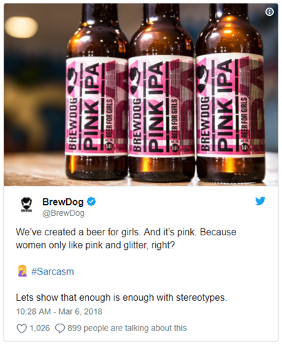 An innovative and slightly risky campaign that caught my attention this week was Craft beer brewery, BrewDog’s campaign to address the gender pay inequality. In its usual quirky and innovative way the brewery launched a ‘new beer for girls’ – Pink IPA, a beer with pink branding, in contrast to the famous blue branding of Punk IPA. To further highlight the gender pay gap the beer is priced at 20% less for women for the next four weeks. Alongside the 20% discount, the brewery pledged to donate 20% of its profits from sales of the pink and punk IPA to the fight against gender inequality.”